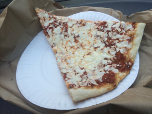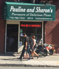 | (✯ ✯ A Cut Above) Pauline & Sharon's is on Brooklyn's 4th Avenue near the entrance to the Prospect Expressway at 17th Street. We were fascinated by the name and went in looking for Pauline or Sharon soon after it opened. Instead, we found a pizza maker who explained that the place is named after his grandmothers.  If you look on Yelp you will find, in general, very good reviews of the pizza and very funny comments about the guy working the oven.  We can confirm that customer contact can range from business like to gruff (check the sign on the wall warning against asking for credit) . Another strange aspect of this pizzeria is its hours.  Since we drive by this place all the time we can never depend on being able to grab a slice; Yes this guy makes pizza when the mood strikes him.  Maybe that's why it's so good!  The slices are enormous and they vary in style from time to time.  Its definitely worth a try. |